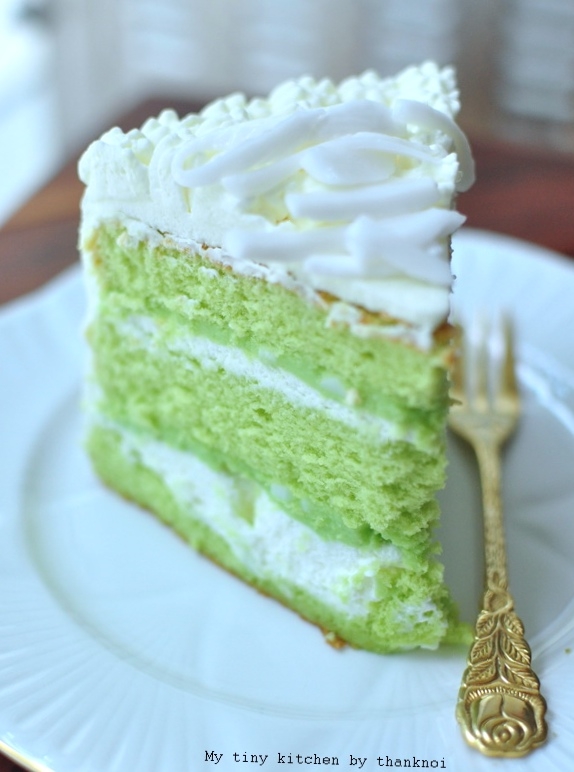 เค้กสำหรับคนรักใบเตยและมะพร้าวอ่อน เนื้อเค้กชิฟฟอนใบเตยที่ทั้งนุ่มและหอมใบเตยมาพร้อมครีมใบเตยมะพร้าวอ่อนและครีมที่นุ่มละมุนละลายได้ปาก